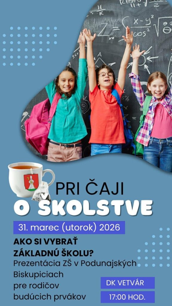 Podujatie pre rodičov budúcich prvákov “Pri čaji o školstve” sa bude konať v utorok 31. marca 2026 v Dome kultúry Vetvár o 17:00 hod. , ste vítaní.